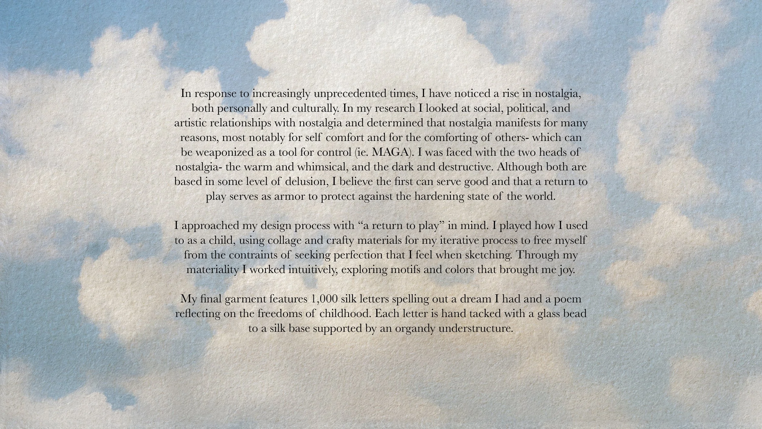 The dream and poem spelled out on the dress, accompanied by personal and found footage.
